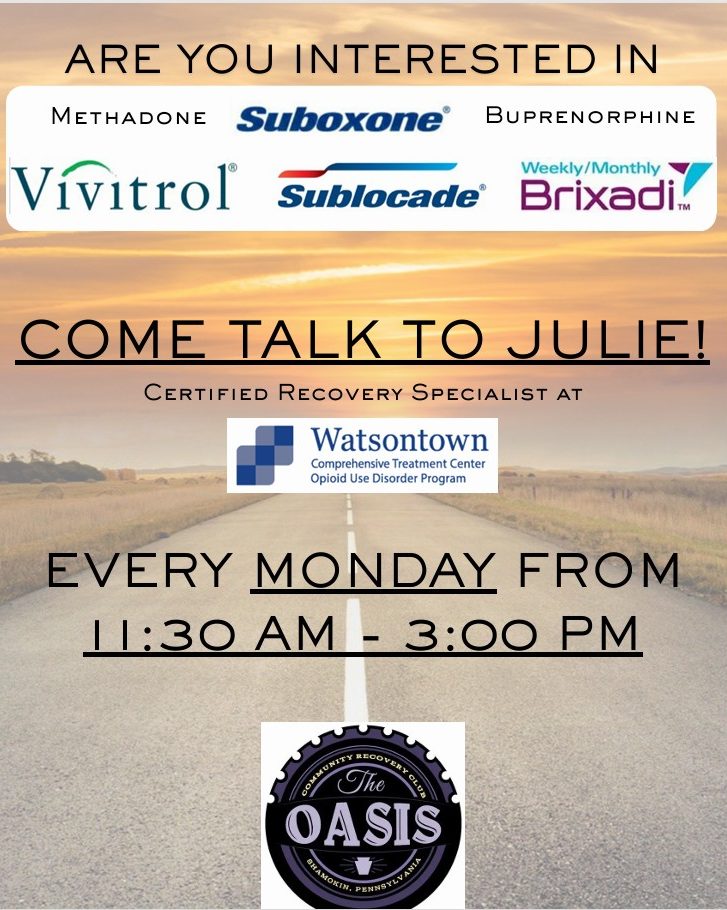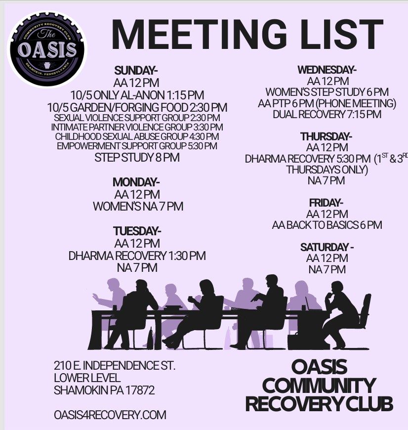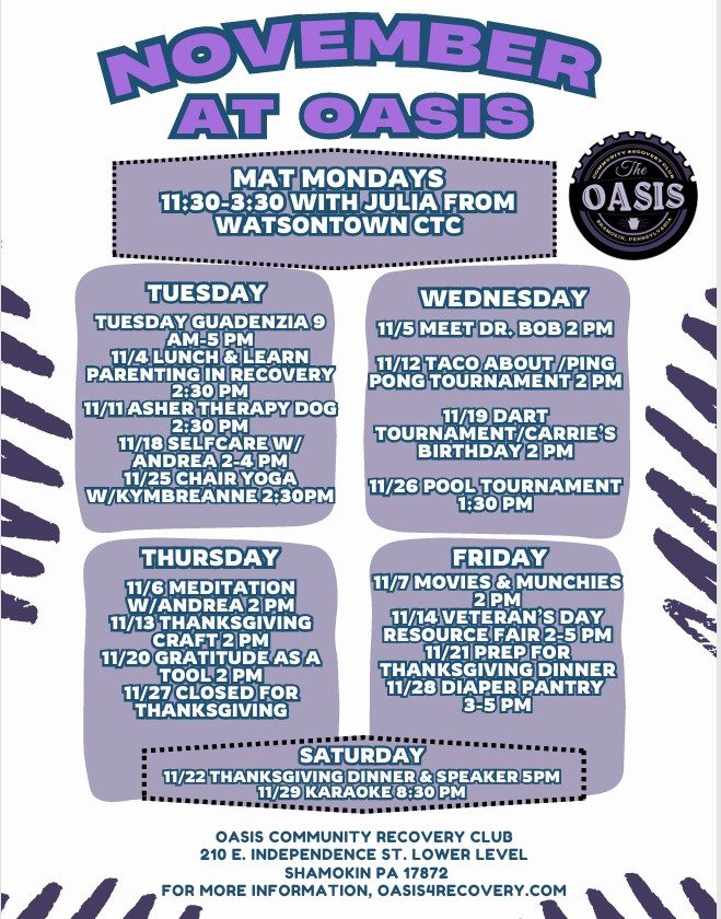 Oasis is open Monday-Friday 11 am- 7 pm, providing a safe, welcoming space for anyone in recovery to relax, connect, and recharge. Stop by for coffee, conversation, or to join one of our daily programs- no appointment needed! Our staff is here to provide recovery resources, support, and community connections. Whether you're seeking guidance, encouragement, or just a friendly space to be, Oasis is here for you.