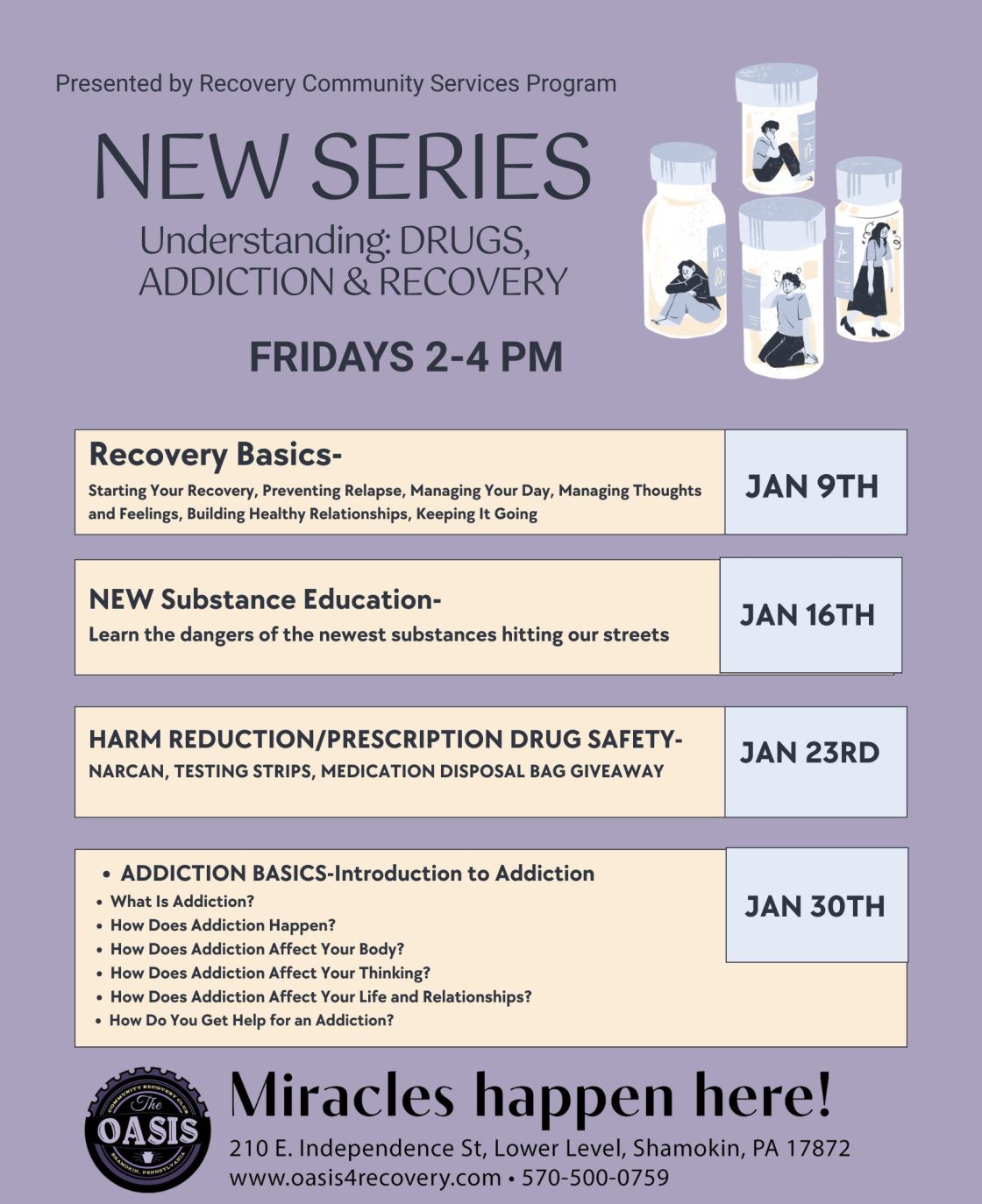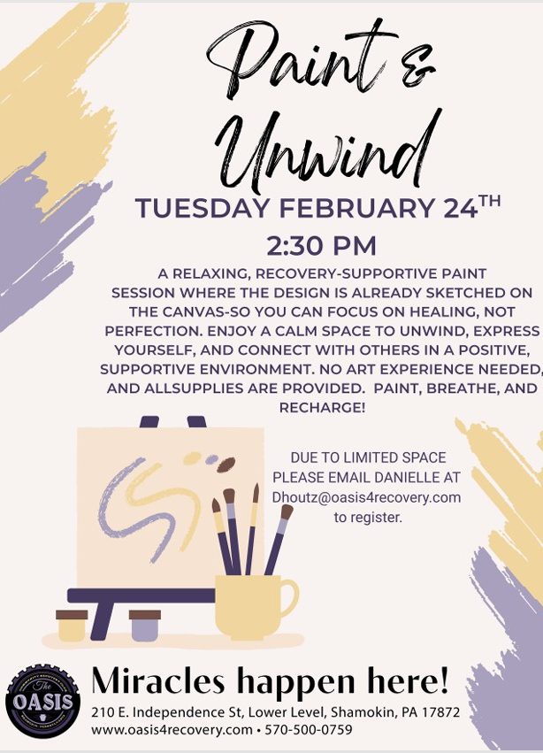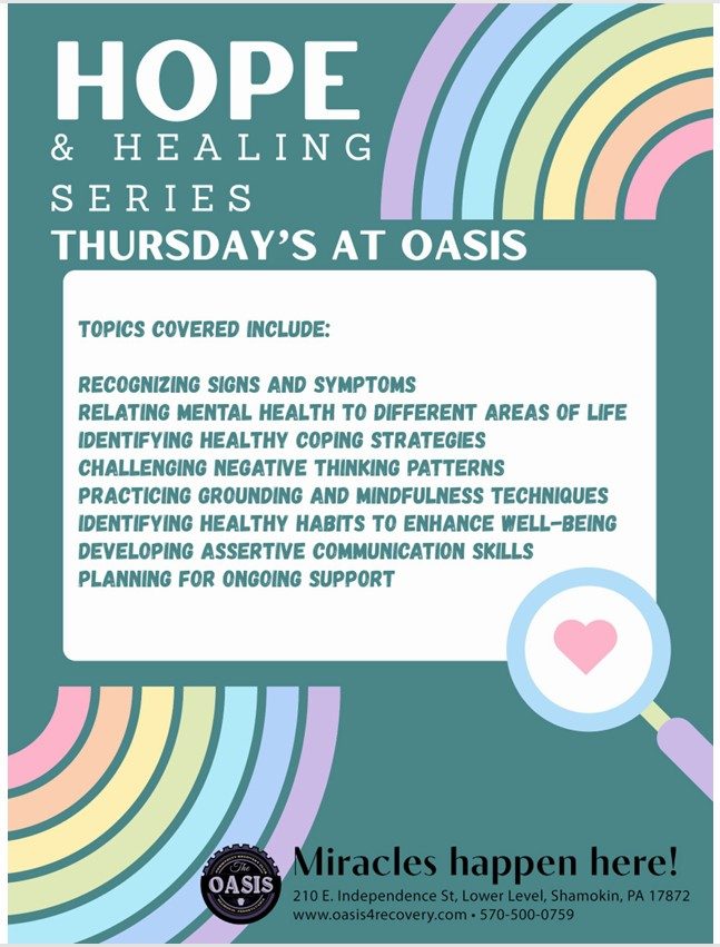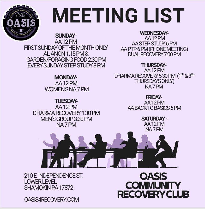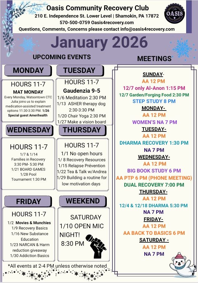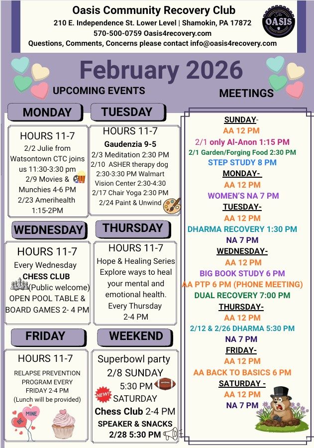 Oasis is open Monday-Friday 11 am- 7 pm, providing a safe, welcoming space for anyone in recovery to relax, connect, and recharge. Stop by for coffee, conversation, or to join one of our daily programs- no appointment needed! Our staff is here to provide recovery resources, support, and community connections. Whether you're seeking guidance, encouragement, or just a friendly space to be, Oasis is here for you.