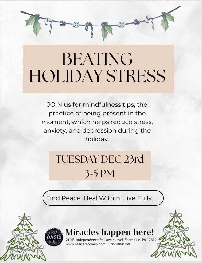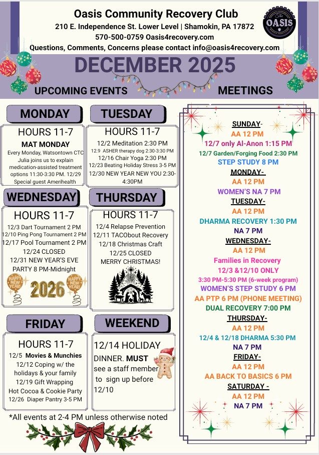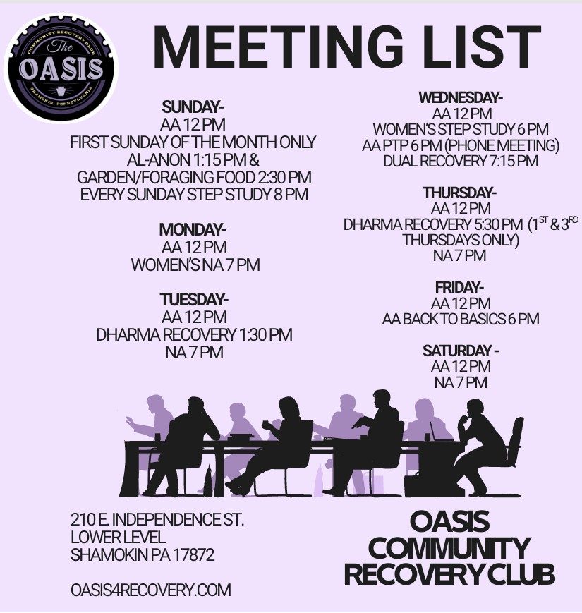 Oasis is open Monday-Friday 11 am- 7 pm, providing a safe, welcoming space for anyone in recovery to relax, connect, and recharge. Stop by for coffee, conversation, or to join one of our daily programs- no appointment needed! Our staff is here to provide recovery resources, support, and community connections. Whether you're seeking guidance, encouragement, or just a friendly space to be, Oasis is here for you.